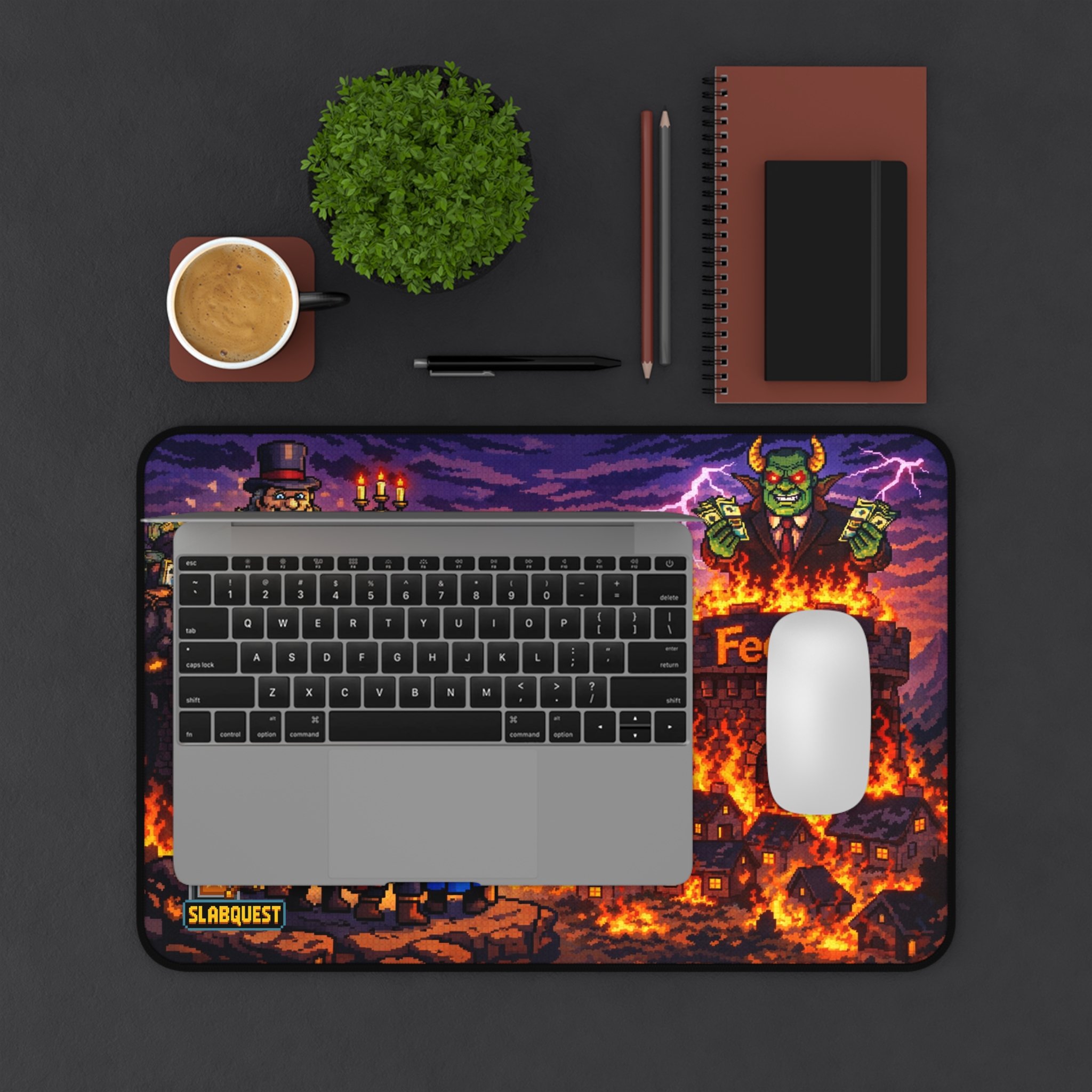 A bold, illustrated desk mat that turns any workstation into a story. Deep, pixel-style artwork shows adventurers approaching a burning town and a looming villain atop a fortress—bright, high-contrast colors bring every ember and lightning strike to life. The neoprene surface is smooth for mouse glide and comfortable for writing or crafting. Hemmed edges and an anti-slip backing keep the mat secure through long sessions. Available in three sizes to fit compact desks or wide setups, this piece doubles as functional protection and an eye-catching conversation starter for gamers, pixel-art fans, and indie-creators.